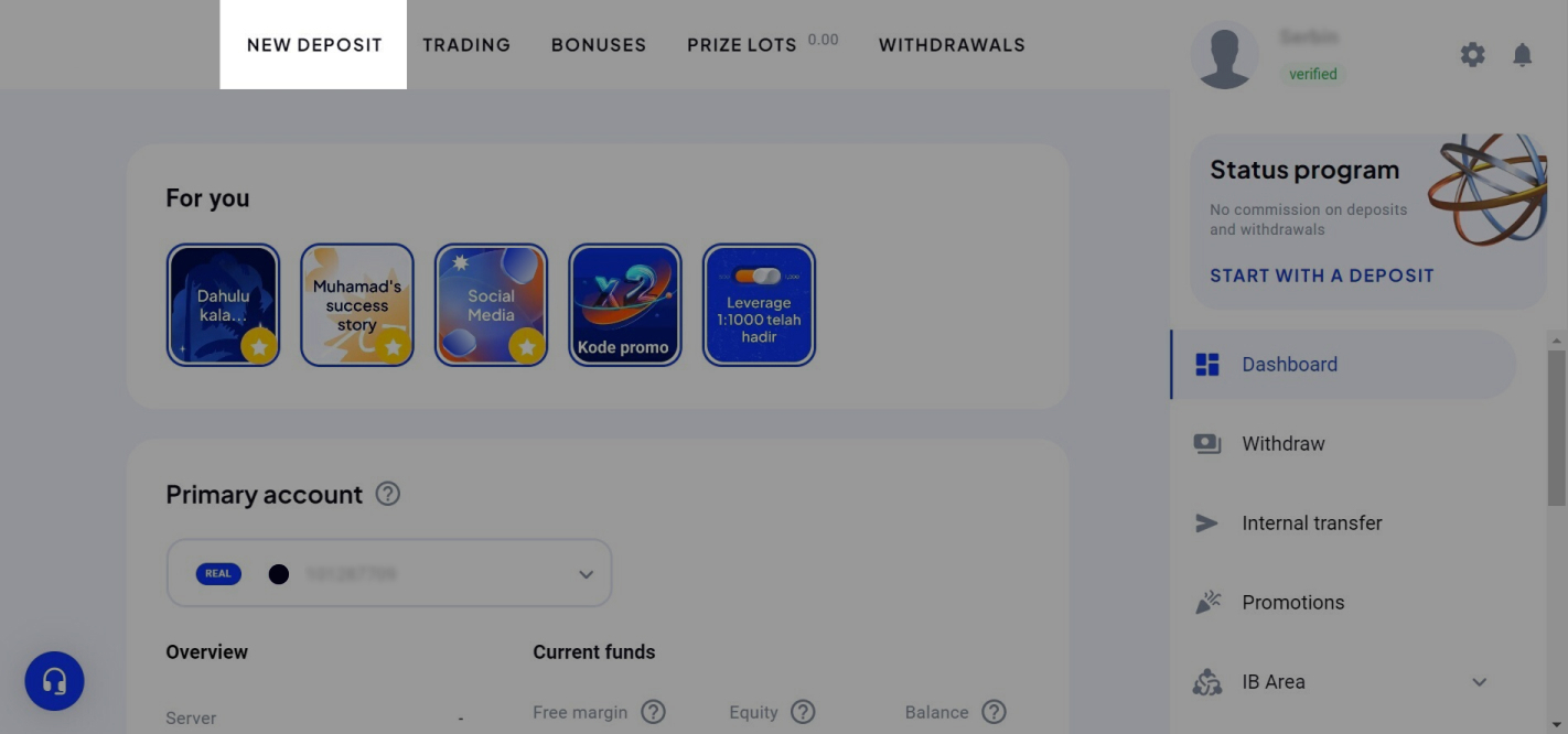 Deposits work the same way for all account types. Just select the account you want to top up, choose a payment method, and follow the instructions.